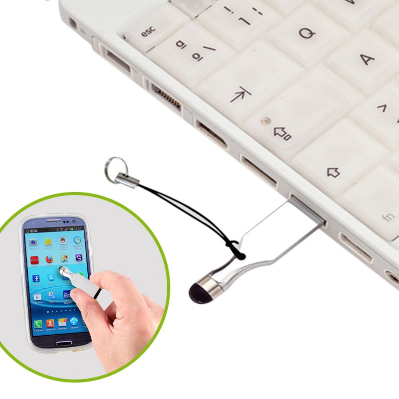 USB Pen Drive metálico de 8 GB de capacidad, con puntero Touch-Screen y cordón para colgar. Presentación en estuche de Aluminio con ventana.