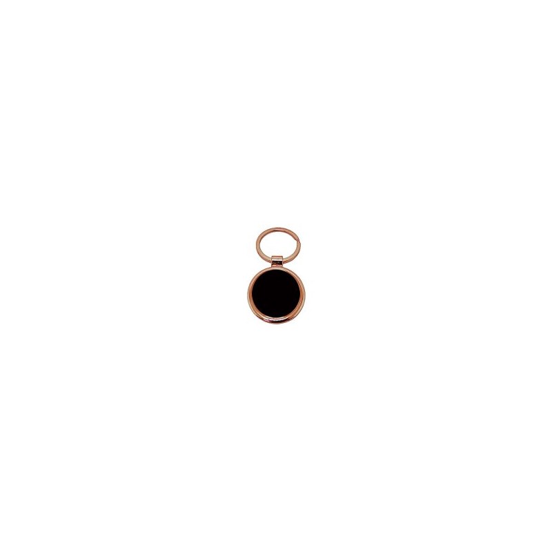 Llavero metálico redondo encobrizado con placa negra. Presentación en estuche de cartón negra.