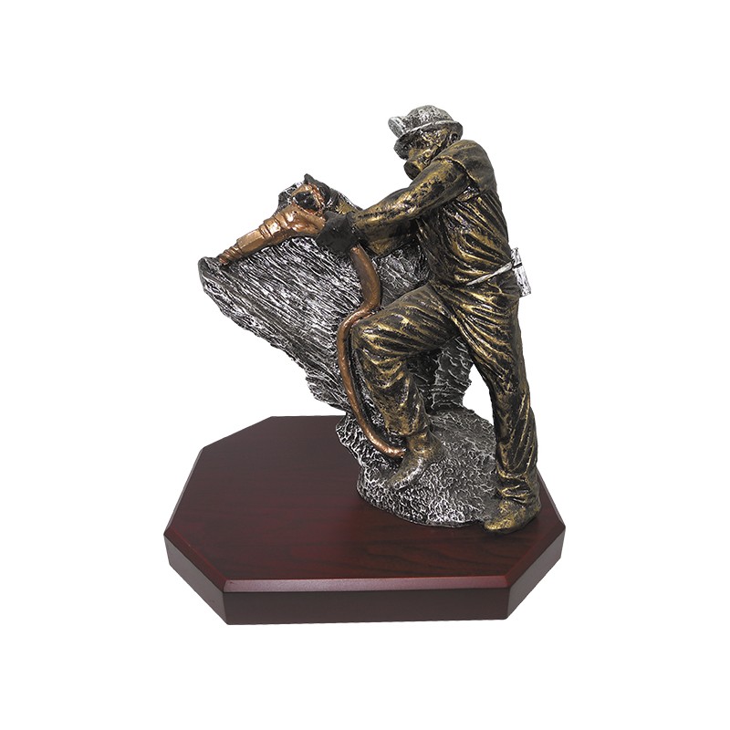 Trofeo de resina con figura de minero. Incluye base de madera. Presentación en caja de cartón con interior de aislapol..
