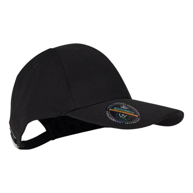 Gorro tipo Jockey de poliéster, con protección UV UPF 50+, con traba metálica plateada y pasador metálico posterior.