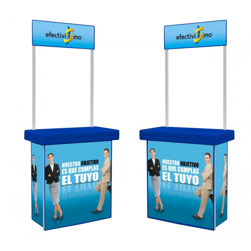 El stand portátil es de cubiertas de Plástico inyectado de alta resistencia y calidad, posee pilares metálicos de color blanco de ensambles, destaca por su eficiencia en el punto de venta y posee dos áreas gráficas para el desarrollo de imagen. Su peso estimado es de 7 kg y es desarmable para poder ser guardado en la bolsa de genero la cual está incluida sin costo en el valor del producto.(Sujeto a disponibilidad de stock).