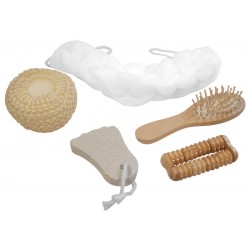 Canasto SPA de belleza en madera modelo "Naturals". Contiene cepillo de pelo, esponja malla, masajeador de madera, piedra pomez y esponja de masaje corporal.