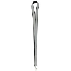 Lanyard Reflectante Plateado. Reverso polyester negro de 2 cm de ancho, con terminación mosquetón metálico.