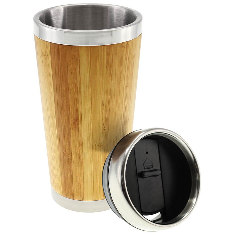 Mug de madera de Bamboo, interior de Acero Inoxidable, tapa con dosificador.