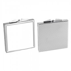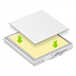 Espejo metálico cuadrado doble, con tapa, con cuadrado para Sublimación. Presentación en caja laminada blanca.