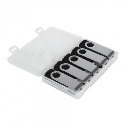 Set de 5 USB Pendrive 2.0 de 64GB de memoria cada Pendrive, con carcasa metálica de giro. Cada Pendrive tiene la particularidad de venir con cuerpo plástico bicolor: por un lado un color blanco común para todos los Pendrive, y por el otro, cuerpo de color con los colores clásicos de Promo Import. Presentación en Estuche de PVC translúcido de regalo.
