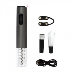 Deluxe Set de Vino Eléctrico con cargador USB/Micro-USB, materialidad plástico ABS negro + acero inoxidable. Contiene: 1 Descorchador eléctrico con luz azul + 1 tapón de goma con vacío + 1 vertedor + 1 cortador sello botella. Potencia Cargador USB: 500mAh. Presentación en caja de regalo con gráfica y fotografía del producto a todo color.