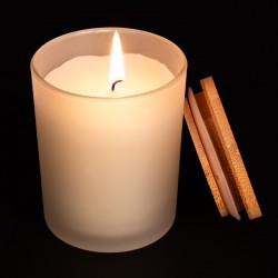 Vela aromática de 8oz en envase redondo de vidrio empavonado con tapa de Bamboo. Aroma a Vainilla. Ideal para regalo de hogar y aromaterapia. Amplia superficie de impresión de logo.