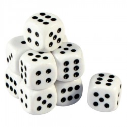 Dado de juego, extra-blanco, con puntos negros. Presentación en paquetes de 10 unidades.