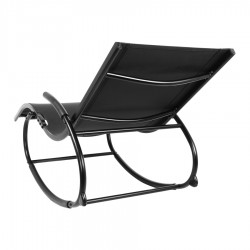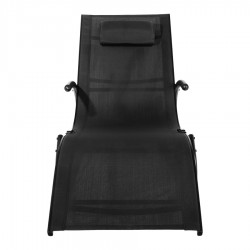 Reposera mecedora negra con apoya-brazos, modelo «Ventus». Estructura de Aluminio color negro, asiento de Textilene negro. Descanso y relajo verdaderos.