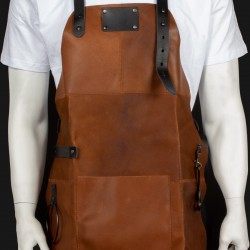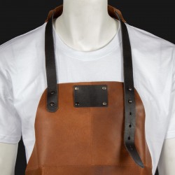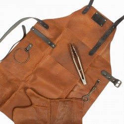 Un regalo fuera de serie. Deluxe set de Asador, contiene Pechera de Asador BBQ en Cuero engamuzado 100% genuino color café cognac, con cintas y rectángulo de 8 x 5 cm. de Cuero 100% genuino color negro. Argolla, destapador y remaches de acero envejecido y bolsillo delantero de 20 x 21 cm. Contiene además largo mitón de Asador BBQ en Cuero engamuzado 100% genuino color café cognac y tenazas de Acero inoxidable. Presentación en elegante caja de regalo de cartón negro con ventana de mica transparente y gráfica a todo color con descripción de los elementos del set.