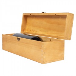Caja de Madera natural de Teca, para botella de vino. Con broche color bronce envejecido.