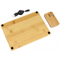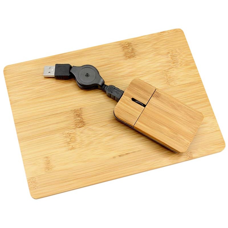 Set USB Mouse óptico + Pad 100% de madera de Bamboo. Incluye cable y conector USB.
