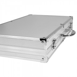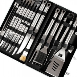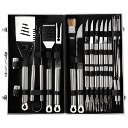 Deluxe BBQ set de asado en caja metálica. Incluye 24 herramientas de asado 100% acero inoxidable. Interior recubierto en tela ecológica negra. Manilla y cierres metálicos. Incluye placa metálica rectangular para grabar logo. Presentación bubble-bag.