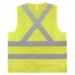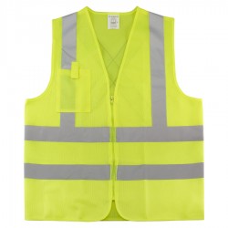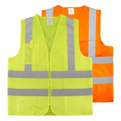 Chaleco Reflectante de Seguridad modelo «Traffic», 100% tela poliéster fluorescente con bandas reflectantes color plateado de 5 cm. de ancho. Incluye cierre eclair y bolsillo delantero superior derecho. Cumple con norma vigente de Ley del Tránsito y norma legal EN 471.