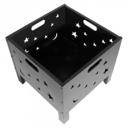 Brasero para Leña o Carbón, de Acero negro, modelo «Constelación». Bowl para fuego: 50 x 50 x 33cm x 10.6mm. Fácil de armar y transportar. Incluye Manual instructivo de armado en español.