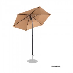 Quitasol redondo de Ø2m, modelo «Twist», con 6 cascos de lona Poliéster UV impermeable de 160g. Contiene varas reforzadas de Acero recubierto de 12 x 18mm, asta de Acero recubierto de 32mm, sistema de apertura manual y codo giratorio de 45°. No incluye base.