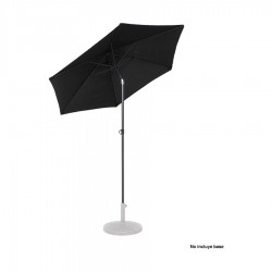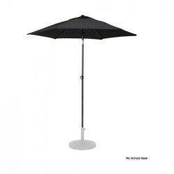 Quitasol redondo de Ø2m, modelo «Twist», con 6 cascos de lona Poliéster UV impermeable de 160g. Contiene varas reforzadas de Acero recubierto de 12 x 18mm, asta de Acero recubierto de 32mm, sistema de apertura manual y codo giratorio de 45°. No incluye base.