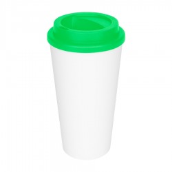 Vaso de polipropileno (PP) blanco doble pared, para líquidos fríos y tibios, con tapa rosca de color. Cuerpo cónico liso, para amplia impresión de logo. Producto BPA FREE, para el contacto con líquidos y alimentos. Capacidad 500ml. Presentación en caja de cartón color blanco.