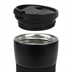 Mug térmico metálico doble pared aislante, modelo «DRIVEN», interior Acero inoxidable 304 SS, exterior Acero inoxidable 201 SS color negro mate, con cinturón de silicona negra. Producto BPA FREE, para el contacto con líquidos y alimentos. Tapa rosca de plástico PP con sello cilíndrico de silicona y sistema de cierre/apertura antiderrame. Fondo de silicona negra ABS anti-deslizante. Capacidad 500ml. Presentación en bolsa plástica OPP + caja de regalo de cartón laminado negro.