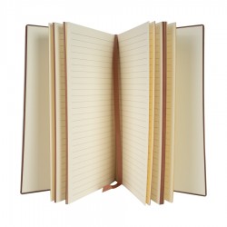 Cuaderno tamaño A5, con cubierta de PU eco-cuero de 2mm de espesor y lomo pintado de color al tono. Interior 80 hojas lineadas amarillas de 80gsm. Incluye banda separador de hojas al tono. Presentación individual en bolsa de polipropileno.