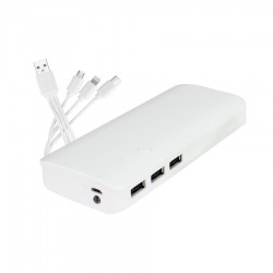 Cargador Power-Bank USB de 13000mAh, con indicador de carga y Linterna LED. Capacidad 13000mAh. Input: DC 5V 2A / Output: DC 5V 1A*3. Incluye set de cables de carga USB (Micro-USB / Lightning / Type C). Presentación en Estuche de cartulina blanca.