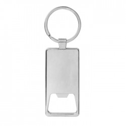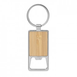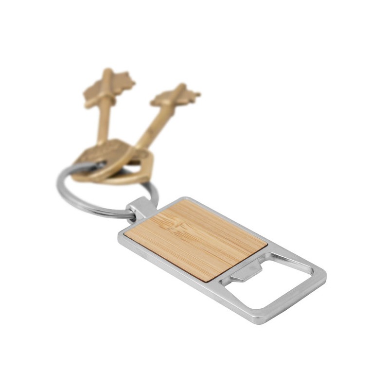 Llavero con destapador abre botellas. Estructura metálica con aleación de zinc con acabado brillante y panel frontal de bambú barnizado