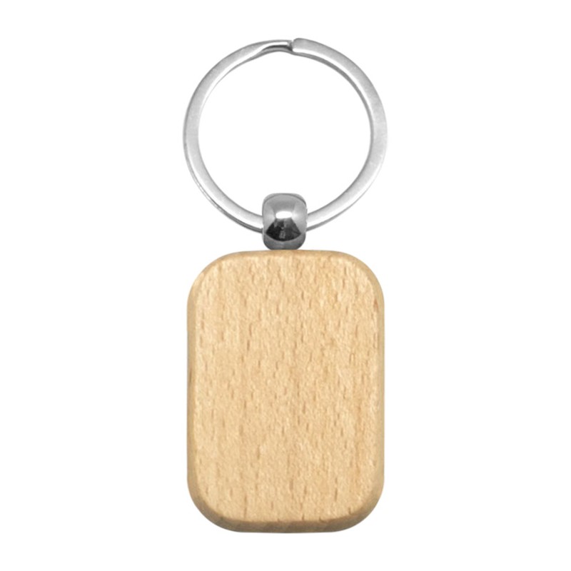 4,2 x 3 x 0,7 cm. (La medida no incluye el aro) Madera. Llavero rectangular con arandela metálica.