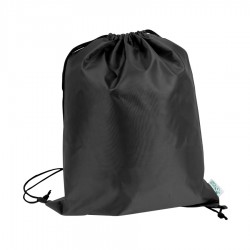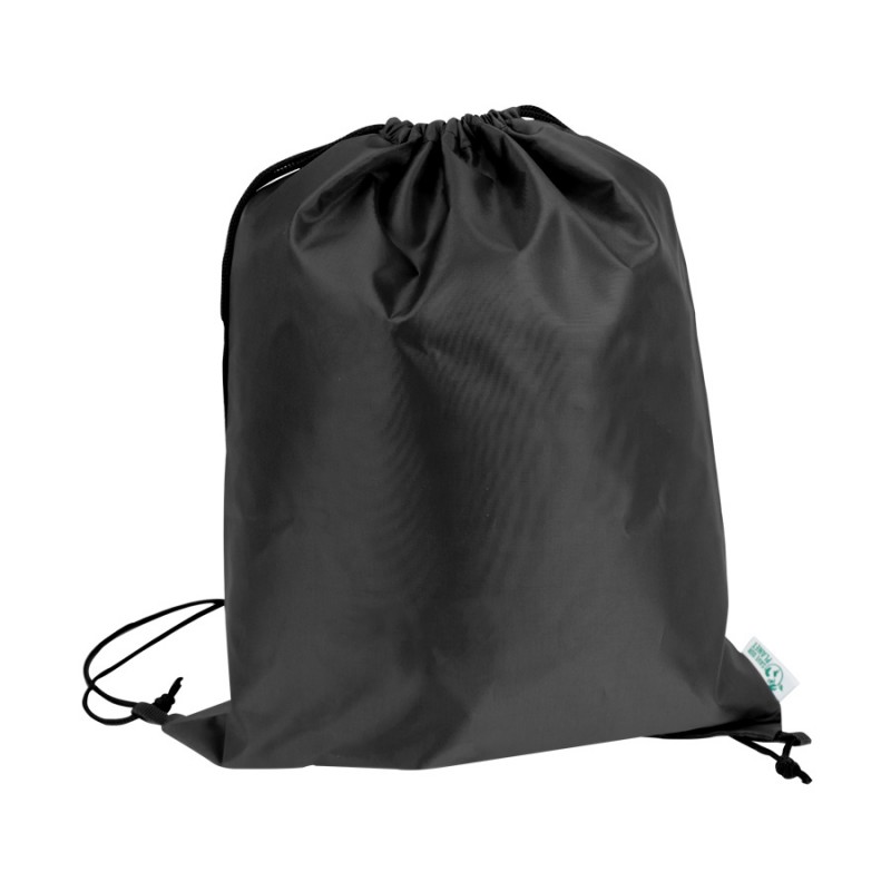 Mochila tipo Morral, fabricada en tela reciclada RPET, con tiras de cordón también el tela reciclada RPET .