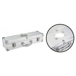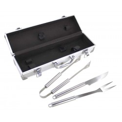 Deluxe BBQ set de asado en caja metálica. Incluye 3 herramientas de asado 100% acero inoxidable: cuchillo, tenedor y tenazas. Interior recubierto en tela ecológica negra. Manilla y cierres metálicos. Incluye placa metálica rectangular para grabar logo. Presentación bubble-bag + elegante caja de cartón laminado plateado.