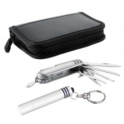 Set de Supervivencia "XD", incluye Cortapluma 12 funciones + Llavero-Linterna LED metálica de 9 cm + 3 pilas botón tipo AG3, presentación en elegante Estuche Negro con Gris.