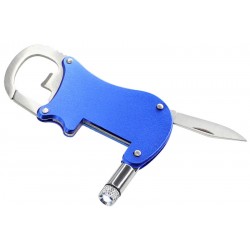 Multiherramienta metálica 4-en-1 con Linterna LED, Navaja, Destapador y Mosquetón.