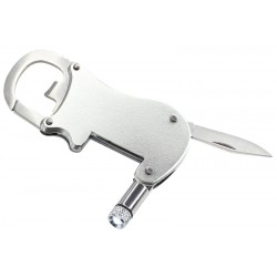 Multiherramienta metálica 4-en-1 con Linterna LED, Navaja, Destapador y Mosquetón.