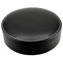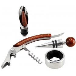 Set de 4 accesorios metálicos para el vino, con terminales de madera barnizada, presentación en estuche redondo de PU negro con tapa.