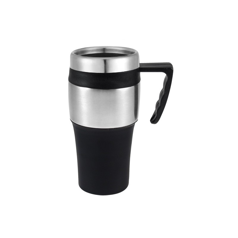 Mug térmico de doble pared aislante con tapa rosca de acero inoxidable y dosificador. Interior de PVC negro y exterior de PVC negro y acero inoxidable.