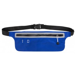 Banano impermeable, en tela Polyester Stretch 210 Waterproof. Incluye banda-cinturón elasticado ajustable color negro, bandas reflectantes color plateado, cierre-eclair impermeable y doble compartimento, uno para smart-phone, otro para accesorios como llaves o monedas.