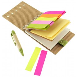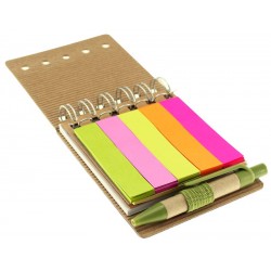 Memo Set Ecológico. Incluye Bolígrafo Ecológico corto + 125 banderitas adhesivas de colores + 25 notas adhesivas cuadradas + Block de Notas 40 hojas blancas. Tapas gruesas cartón ecológico 600gsm, exterior liso/interior plisado, en Espiral Doble Cero Metálico.