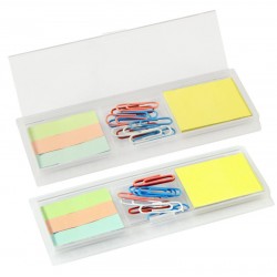 Porta notas adhesivas con clips de colores. Incluye 1 taco de notas adhesivas de 40 hojas de 4,8 x 3,6 cm + 3 tacos de 25 banderitas adhesivas de 4,8 x 1,2 cm + 10 clips recubiertos de colores. Regla de 14 cm y de 5,5".