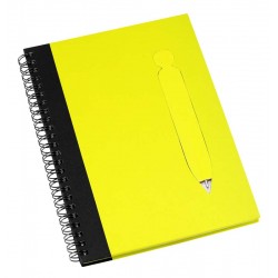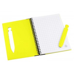 Cuaderno Ecológico con Tapas Duras de Color, en Cartón Reciclado 650gsm, 70 hojas interiores cuadriculadas y anillado metalico doble cero. Incluye Bolígrafo Ecológico de cartón troquelado, incrustado en la tapa.