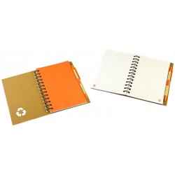 Cuaderno Ecológico con Tapas Duras de Cartón Reciclado 650gsm, 70 hojas interiores lineadas y anillado metalico doble cero. Incluye Bolígrafo Ecológico y logo "Reciclable" troquelado en la tapa.