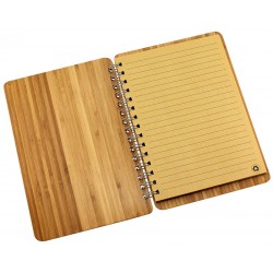Cuaderno Ecológico con Tapas duras punta redondeada 100% de madera de Bamboo de 3mm de espesor, interior 70 hojas lineadas interiores de papel kraft reciclado de 14.3 x 20 cm y anillado metálico doble cero.