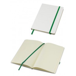 Cuaderno modelo "Whiteskine" tamaño A5, con cubierta de cartón piedra forrada en PU simil cuero blanco de 1.5mm de espesor. Interior 80 hojas limpias amarillas de 80gsm. Incluye banda elástica y huincha separador de hojas de color. Presentación individual en bolsa de polipropileno.