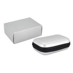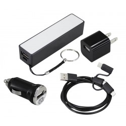Kit de Conexión para el Automóvil. Contiene cargador USB para encendedor / toma de corriente del automóvil, Power Bank de 2500 mAh, toma-corriente con terminal USB y multi-cable adaptador USB de 1m de largo, con 3 terminales para iPhone / Samsung / Type C. Presentación en estuche EVA pouch plateado con interior negro, en caja de cartulina plateada.