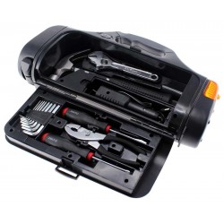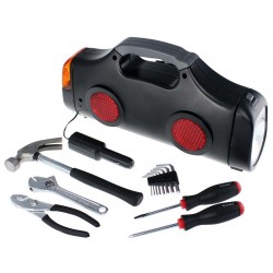 Kit de Emergencia para el Vehículo en plástico ABS negro. Incluye 13 Herramientas, Linterna, Luz naranja intermitente, 2 focos reflectantes redondos rojos y un cargador para conexión al encendedor del vehículo.