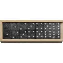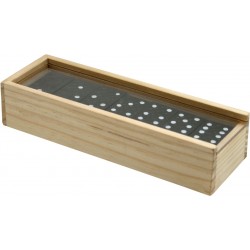 15 x 5 x 3 cm. Plástico y madera. Juego de domino con 28 piezas plásticas, caja de madera y tapa plástica transparente.
