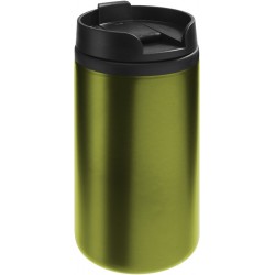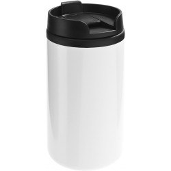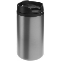 Ø 7 x 14 cm. Capacidad 250 ml. Acero inoxidable y plástico. Mug térmico doble pared, exterior de acero inoxidable 201, interior de plástico, tapa rosca en plástico con apertura para beber. Irrompible. Base antideslizante