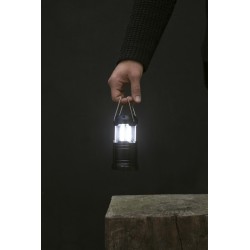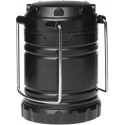 Ø 6 x 9,5 cm (cerrado) Ø 6 x 13,5 cm (abierto). Plástico. Farol de luz led con dos agarraderas metálicas. Al desplegarse hacia arriba se enciende la luz. Funciona con 3 baterías AAA (no incluidas)