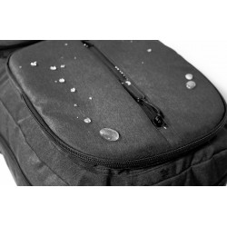 32 x 43,3 x 15,5 cm. Capacidad 21 litros. Polyester 300D Wulong, parte interior poliester 200D. Tela y cierre resistente al agua. Compartimento principal para porta laptop. Dos bolsillos frontales con cierre y un bolsillo horizontal con cierre. Manija superior y correas acolchonadas. Parte trasera acolchonada con tira para poder pasar sobre la manija de las valijas. Tiradores de cierres metálicos