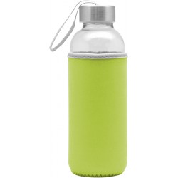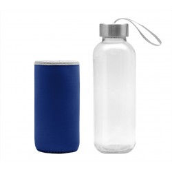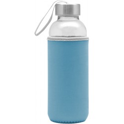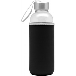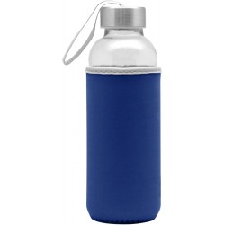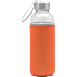 Ø 5,5 x 19,5 cm. Capacidad 440 ml. Vidrio. Cuerpo traslúcido. Contiene funda de neopren que permite no calentar la bebida con las manos. Tapa de acero inoxidable con tira de tela.