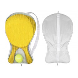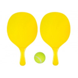 Set de Paletas de Playa de MDF esmaltado de 12mm. de espesor, modelo "Premium". Incluye bolso de tela poliéster blanco con frente malla y cinta para colgar + pelota de tenis amarilla. Cada paleta viene dentro de bolsa de polietileno.